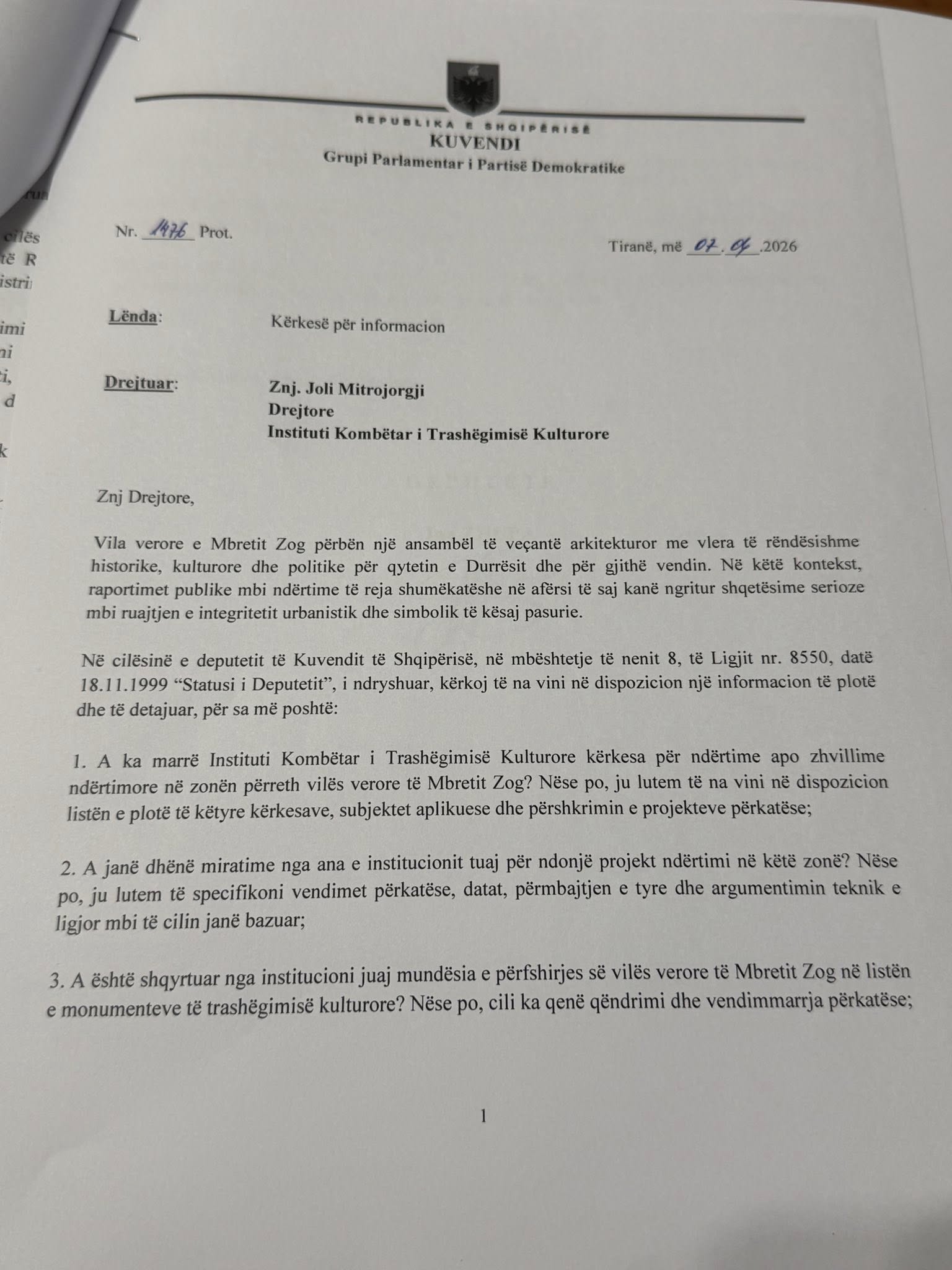 Nisur nga shqetësimet publike mbi ndërtimet e reja shumëkatëshe tek vila verore e Mbretit Zog në Durrës, i jam drejtuar zyrtarisht Institutit të Trashëgimisë Kulturore Kombëtare me një kërkesë për informacion të detajuar.
