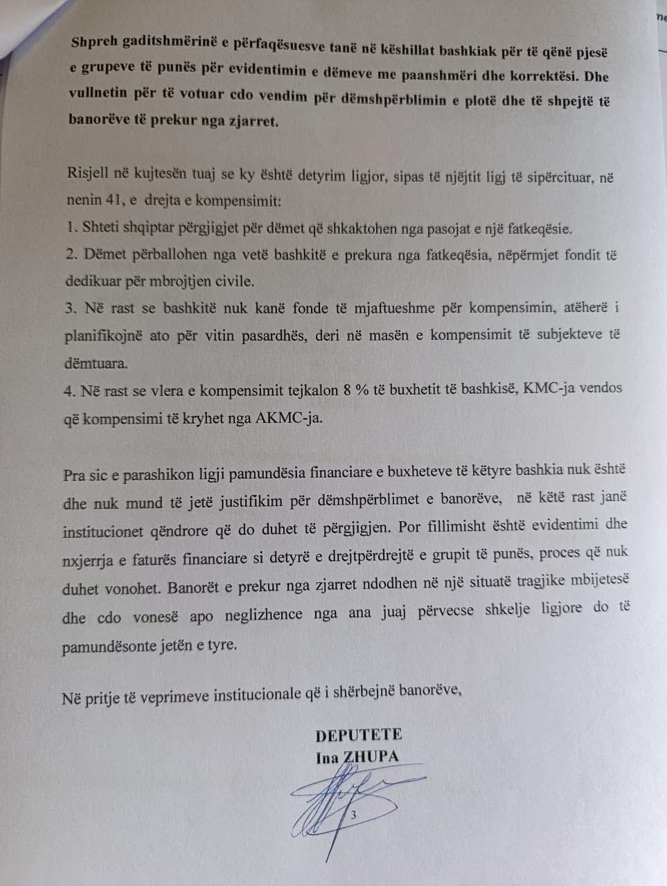 Duke pasur parasysh përmasat e mëdha dhe dëmet kolosale që kanë sjell kërkoj që pa asnjë vonesë në shërbim të banorëve: